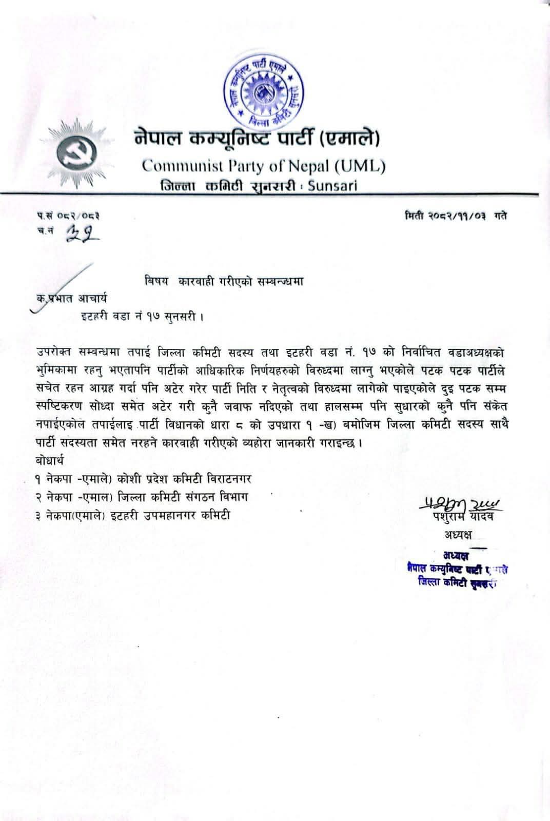सुनसरी — नेपाल कम्युनिस्ट पार्टी (एमाले) जिल्ला कमिटी सुनसरीले इटहरी उपमहानगरपालिका–१७ का वडाध्यक्ष प्रभात आचार्यलाई साधारण सदस्यसमेत नरहने गरी कारबाही गरेको छ। पार्टीका आधिकारिक निर्णयविरुद्ध गतिविधि गरेको, पटक–पटक सचेत गराउँदा पनि नसुध्रिएको र दुई पटक सोधिएको स्पष्टीकरणको चित्तबुझ्दो जवाफ नदिएको भन्दै पार्टी विधानअनुसार सदस्यता खारेज गरिएको एमालेले जनाएको छ।